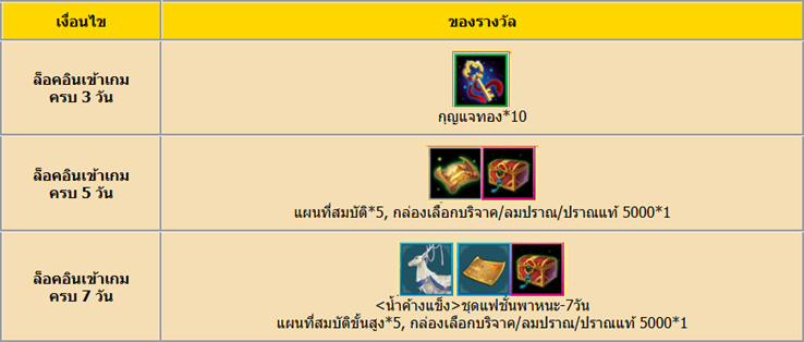 - ในช่วงเวลากิจกรรมหลังจากผู้เล่นลงทะเบียนสำเร็จ เมื่อล็อคอินเข้าเกมต่อเนื่องทุกวัน ครบตามเงื่อนไขที่กำหนดจะได้รับรางวัล