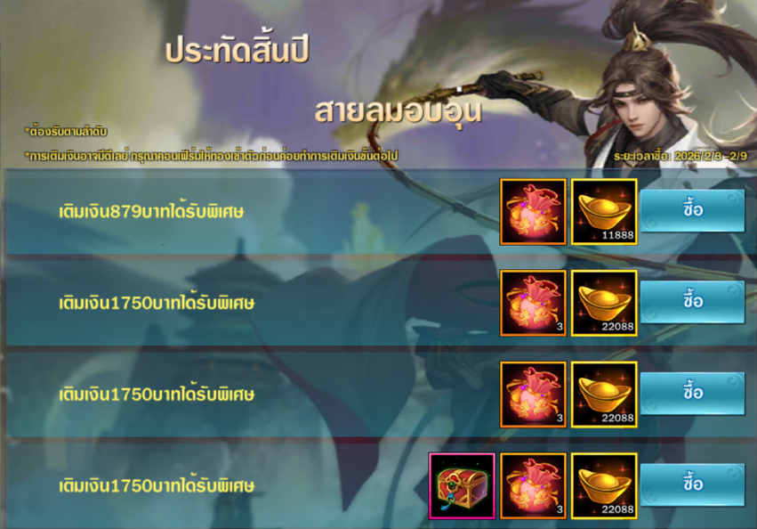 2. เติมเงินผ่านช่องทางสโตร์ที่เรทราคา 69THB, 179THB, 349THB, 529THB, 879THB(เติม 2ครั้ง) และ 1750THB(เติม 3ครั้ง) จะได้รับโบนัสทองตามที่กำหนด