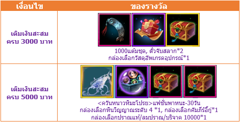 - ในช่วงเวลาโปรโมชั่นเติมเงินสะสมครบ 3000 บาท และ 5000 บาท จะได้รับของขวัญ
