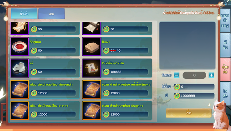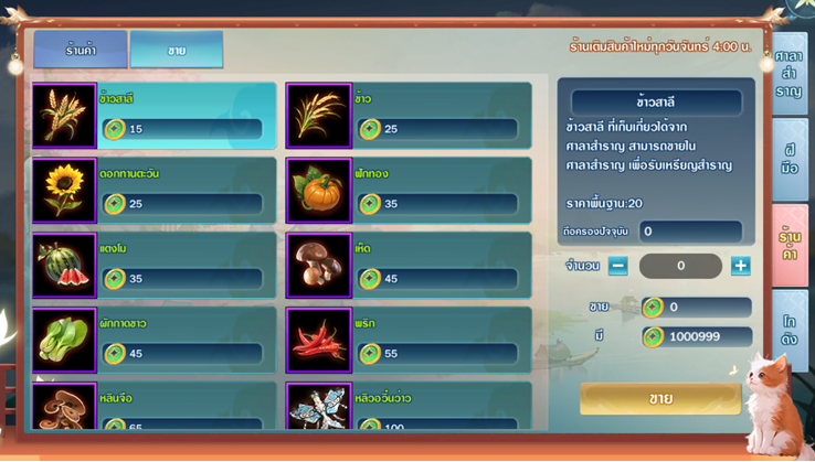จอมยุทธ์สามารถซื้อไอเทมในร้านค้าได้ด้วยเหรียญสราญรมณ์ มีทั้งเมล็ดพันธุ์ วัตถุดิบงานฝีมือ และสินค้าพิเศษ เช่น โฉนดที่ดินบ้านใหม่ แปลนสิ่งก่อสร้างและเฟอร์นิเจอร์ต่างๆ