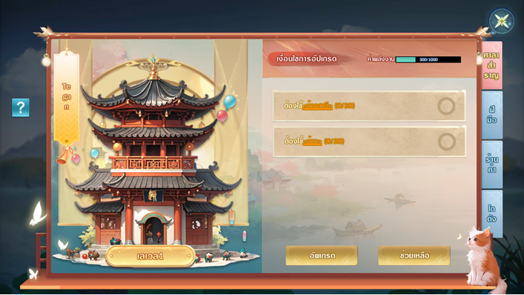 ศาลาสำราญสามารถอัพเกรดเพิ่มระดับได้การอัพเกรดจะปลดล็อคพื้นที่ สินค้าในร้านค้า เมล็ดพันธุ์ และวัตถุดิบงานฝีมือ และเมื่อถึงระดับ 3 แผนที่จะมีการเปลี่ยนแปลงที่หรูหราขึ้น